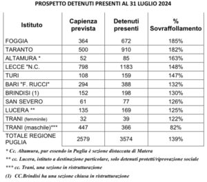 Per quanto riguarda le carenze di personale è sufficiente riportare i dati di alcuni istituti, a partire dal carcere di Bari dove in organico sono previsti 258 unità per una capienza di 294 detenuti, mentre ne abbiamo in servizio solo 221 a fronte di 388 detenuti; il carcere di Foggia che ha un sovraffollamento quasi doppio, con una capienza di 364 sono presenti ben 672 detenuti, mentre il personale in servizio è sotto le 240 unità, quando invece per il numero di detenuti presenti l’organico dovrebbe essere praticamente il doppio; stessa situazione di Foggia si verifica al carcere di Taranto, con un organico dimezzato rispetto ai detenuti presenti. È evidente che con questi numeri la situazione diventa esplosiva. Ed è esattamente quello che è accaduto oggi. Una rivolta che ha visto protagonisti detenuti, che ha coinvolto poliziotti penitenziari feriti nell’adempimento del loro dovere, e addirittura un infermiere sequestrato.